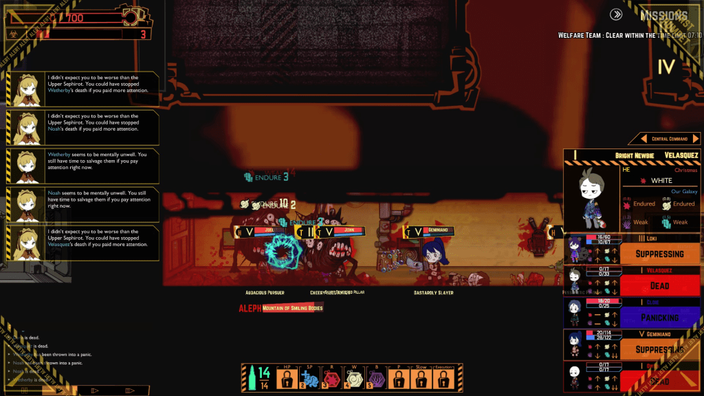The main characters of Lobotomy Corporation are the company’s proprietary AIs: Angela, a wistful administrator who spends her time trying to prepare you for the pressures of the job while also waxing nostalgic about the company’s idealistic goals and her own isolation as an AI; and a number of subservient, lesser AIs, each with their own department, specialty, and gnawing fears. Malkuth, the director of Control, is trying to figure out how to be an effective employee while also remaining sympathetic to the constant mental breakdowns and actual deaths of the employees in her department. Yesod, in Information, is torn between the dual responsibilities of gathering research on the abnormalities while simultaneously redacting and restricting information to the already-terrified employees (and the public). Hod just wants to be a good person, using her position as director of Training to prepare her employees to be the best they can be, even though the best protection she can offer still leaves them likely to die under the corporation’s indifference. Nezach has checked out, doing drugs to cope with the pain, sadness, and suffering on display each day—it’s hard to say whether that is the response of a monster, or the most human of the lot. Tiphereth—the twins—are malfunctioning; one of the two is regularly destroyed and replaced; the other twin doesn’t know how to deal with this, or with the player’s complicit role in the operation. (Yes, they are named after the Sephirot of the Kabbalah and FFVII fame, as well as Eco’s Foucault’s Pendulum— though the order is strangely reversed; the significance of that decision in the game is troubling.)