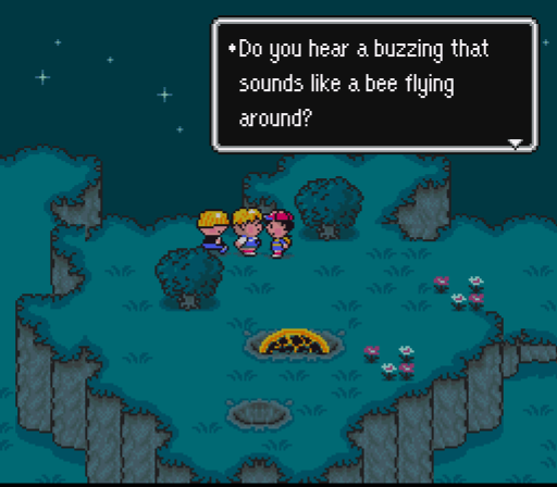 If we are like Giygas in our dealings with this Apple of Wisdom (the games themselves unfolding Itoi’s story), or if we are like Pokey’s mom with respect to Buzz Buzz (messengers like Clyde Mandelin, bringing us new knowledge about it all these years later)–that is, if we are impatiently demanding discursive answers to these questions, they will only lead, at best, to playing the game through again from the beginning (an attempt to go back to the past), and at worst, to doing a violence to the text of the game, silencing it and moving on from its words without giving it another thought. If we are like Ness, though, these questions set us on a journey here and now to grow in “wisdom, courage, and friendship,” and to find “Your Sanctuary.”
