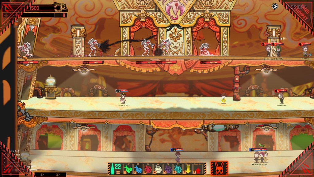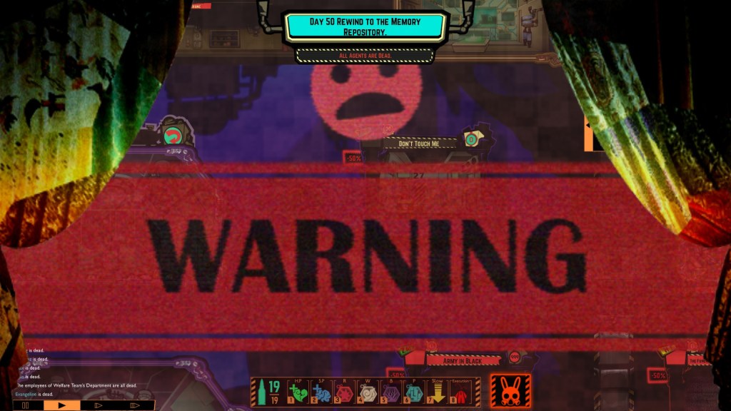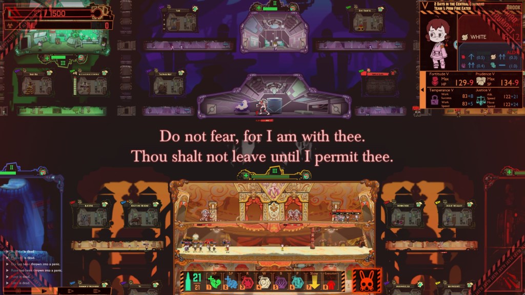 But—she also takes doubled damage from abnormalities.  So rather than try to defeat her by waging this war of attrition, you could just let the abnormalities loose.  Let the facility rot, keep your employees hidden, running, or huddled together, far from the action, while nightmare monsters descend on The Red Mist like some Apocalyptic hell-army.