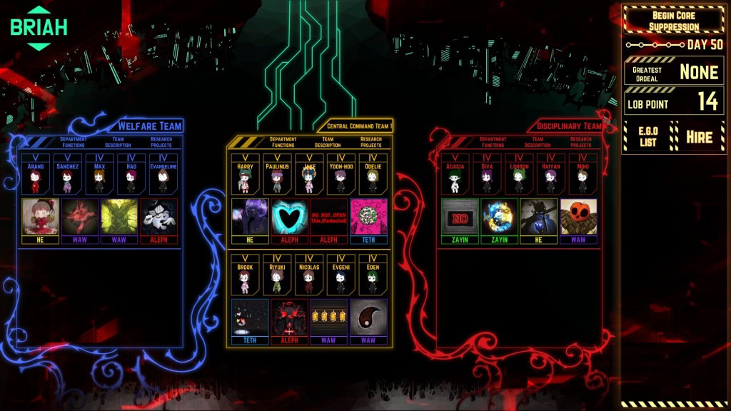So while everything is nice and breezy on Day 1, when you’ve got three employees and one abnormality to worry about, and you’ve only got to work with it three or four times to complete the day, by Day 4 you’re wrangling four abnormalities with only five employees and three times as much energy needed to complete the day.  By Day 20 (out of 50, mind), you’re looking at sixteen abnormalities, twenty employees across four departments, and the obligation to turn in a staggering pile of energy to progress.