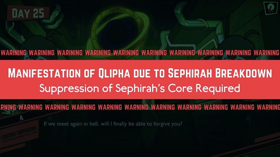 1. Last but not least, there’s the Qliphoth Counter.  Every time you work with an abnormality of any kind, the Q-Counter advances.  Once it fills, one of two things will happen: either a fixed number of abnormalities will become agitated, requiring you to send somebody to work with them before they escape; or, some random gang of wandering abnormalities will just show up out of the blue and mess up your stuff.  The longer the day goes on, the more of these events you’ll have to deal with: and they, too, escalate in strength—from a petty nuisance to a sizable threat to an all-hands-on-deck catastrophe.