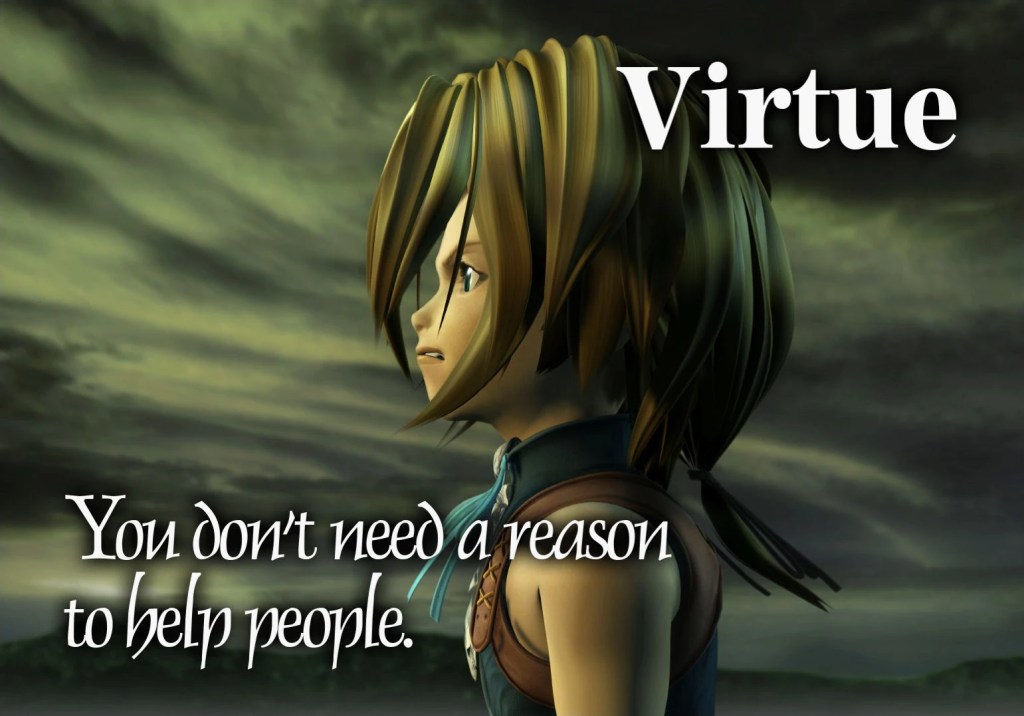 For two-and-a-half discs, Zidane has no arc. He is unabashedly, unapologetically, the heart and soul of the party. He is heroic, and believably heroic at that. He offers good advice to the other characters, helps them through their traumas, decisions, and struggles. He counsels Vivi when he broods about his own existence, helps Garnet through her doubts about running Alexandria, chides Steiner for his elitism and Amarant for his isolationism, encourages Eiko to leave her barren home, helps Freya on her doomed quest, and even encourages Quina to do—whatever it is Quina is doing.