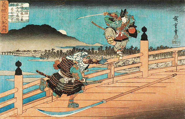 Yoshitsune (right) and Benkei dueling on a bridge in Kyōto. Utagawa Hiroshige (1797–1858) (credit: Kawaharada)