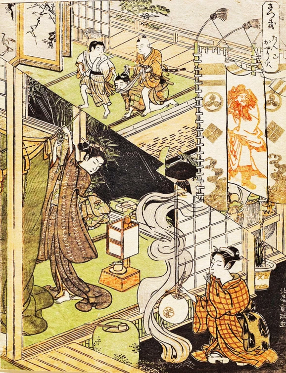 “Fifth Moon” by Kitao Shigemasa (1739-1820): In the top half of the print, three boys celebrate Boys’ Day by playing at being warriors; decorative war banners (at the right margin) are raised for the occasion. (Kawaharada)