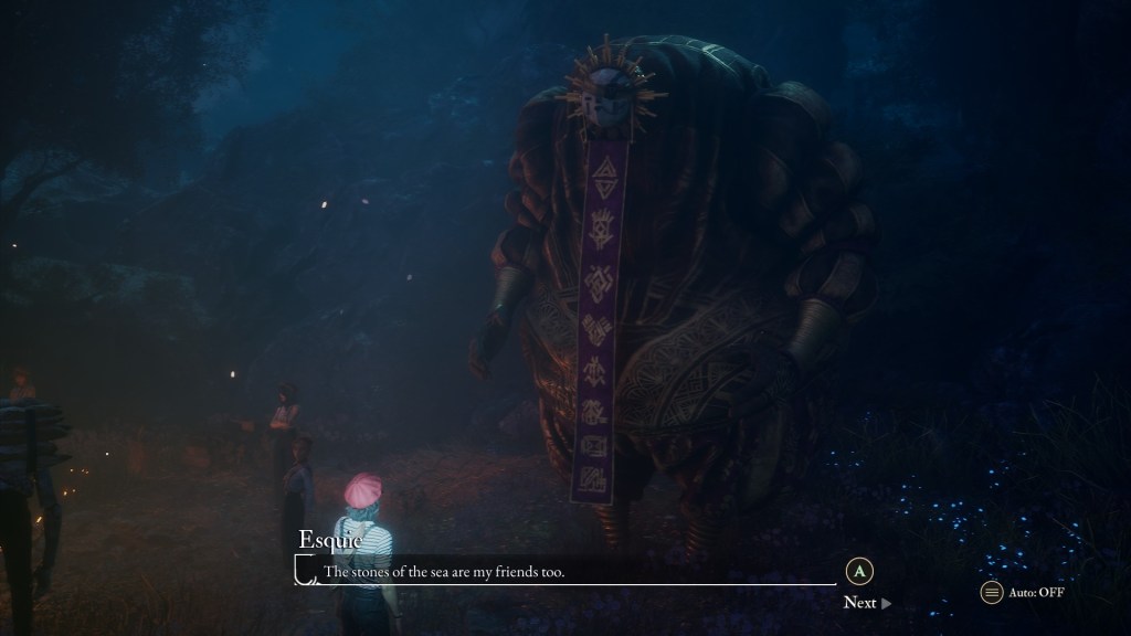 Now François is a prickly soul, superficially cantankerous and mean-tempered—the very opposite of Esquie’s enlightened benevolence—but here it is revealed that François’ prickliness derives from his own grief: he and Clea used to be friends, back when Clea would visit Verso’s Canvas. But since the tragedy, Clea no longer visits anymore, and François misses her. All you need to do, then, is bring François a carved stone depicting Clea sitting on François’ turtle-shell back, and François will relinquish the stone—and weep.