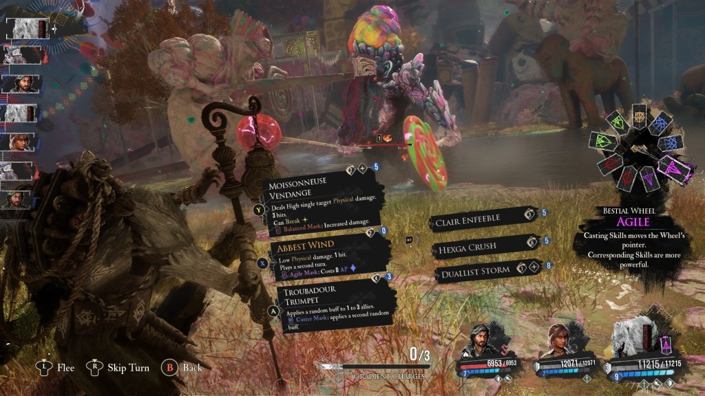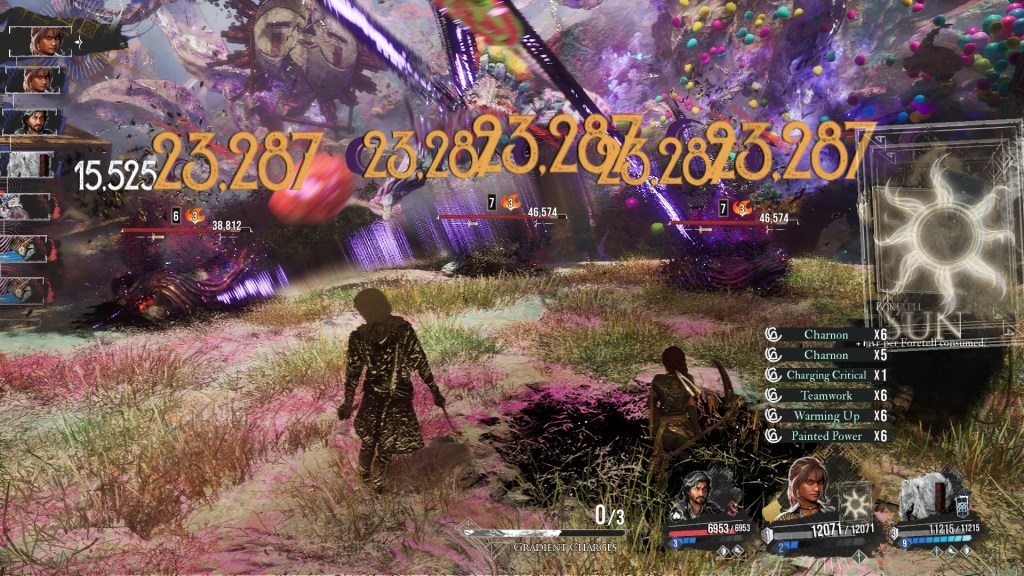 To talk about this we have to back up just a little bit: each of the characters in the party has a dynamically different set of skills and weapons unique to that character. Taken all together, along with the Pictos (which any character can use), there are still a staggering variety of approaches to utilizing each character, but they all tend to focus on certain rhythms and themes.