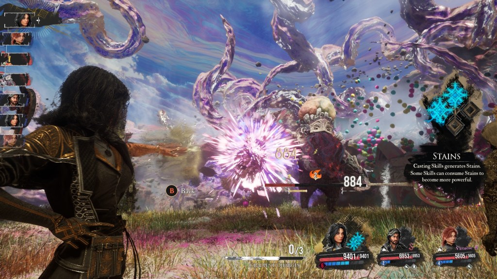 He’s also significantly more durable than Maelle—his ultimate move, learned only after hanging out with Esquie, gives him an auto-revive ability that is frankly invaluable in late-game fights. And that also tracks nicely with his immortality and his silly misuses of that immortality. (Especially funny is his bark upon reviving: “What did I miss?” What a punk.) He also has several self-healing abilities, but, true to his character, I don’t believe he has any skills that heal other party members. The closest he has is “Burden,” which allows him to take all the negative status effects from his allies. To Verso, co-operation is a liability.