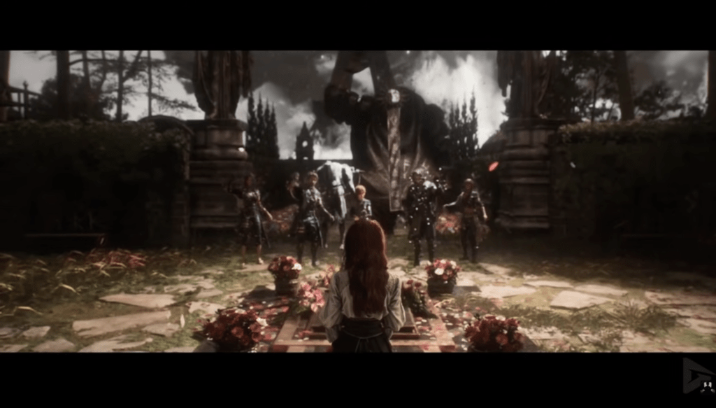 In the final scene, Alicia—the true Alicia Dessendre—stands with Aline and Renoir at Verso’s grave. Alicia clutches a plush doll—Esquie. Some ways off, Clea stands—not quite ready to embrace the family she’s hurt, and that hurt her. And, looking upward across the garden, Alicia sees a final vision: of all her partners: Lune, Sciel, Monoco, Esquie, Verso, Gustave, and, indeed, Maelle all waving one last farewell.