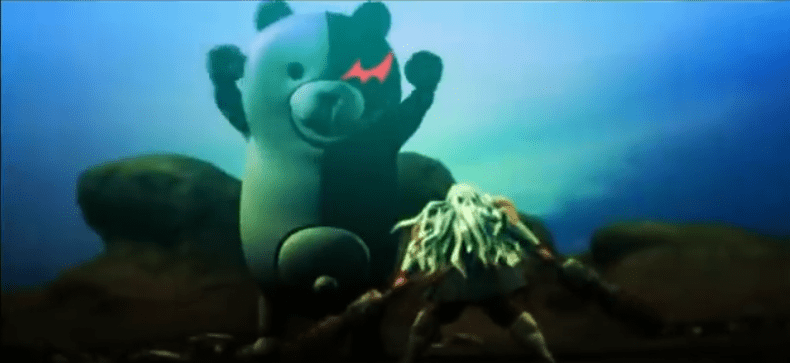 Certainly there can be no turning back for the mastermind(s) behind its apparent destruction. Evidently, despite all the hints to the contrary, dead characters stay dead, and only in bonus content beyond the base story can they all be saved by the opening of the sealed door before the killing begins. When Junko embraces her theatrical multiple-stage suicide reprising each of the executions doled out so far, it includes that rocket-intro movie that we slowly realize accounted for the bones of Kyoko’s father. Like Junko, his face is turned away from us in all other images but this final one. True to the ways of video game villains, Junko provides us everything we needed in order to beat the game, even when she does so more out of determination to lose than due to the actual complete resolution of all the school’s mysteries that she stipulated (after all, we are left with plenty of questions).